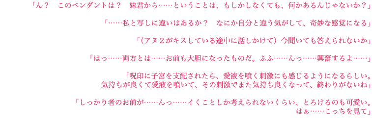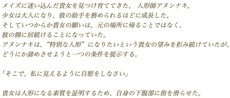 ◆アニメイト限定特典【アバター】 貴女の胸のペンダントには力が封じてあった。中 に仕込まれた鏡を覗き込むと、もう一人のアヌン ナキが実体化する。欲望に忠実な写しと共に貴女 は前後から二人に愛され快楽に溺れる。○○○○