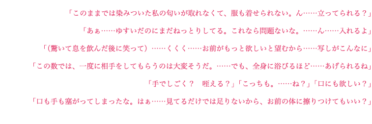 ◆ステラワース限定特典【シロタエ】 染みついたアヌンナキの匂いを落とすため水浴び をするふたり。性欲を高めるその泉は、貴女の欲 情を糧にアヌンナキの力を暴走させる。彼の写し は増えていき貴女は全身に彼を浴びて。○○○○